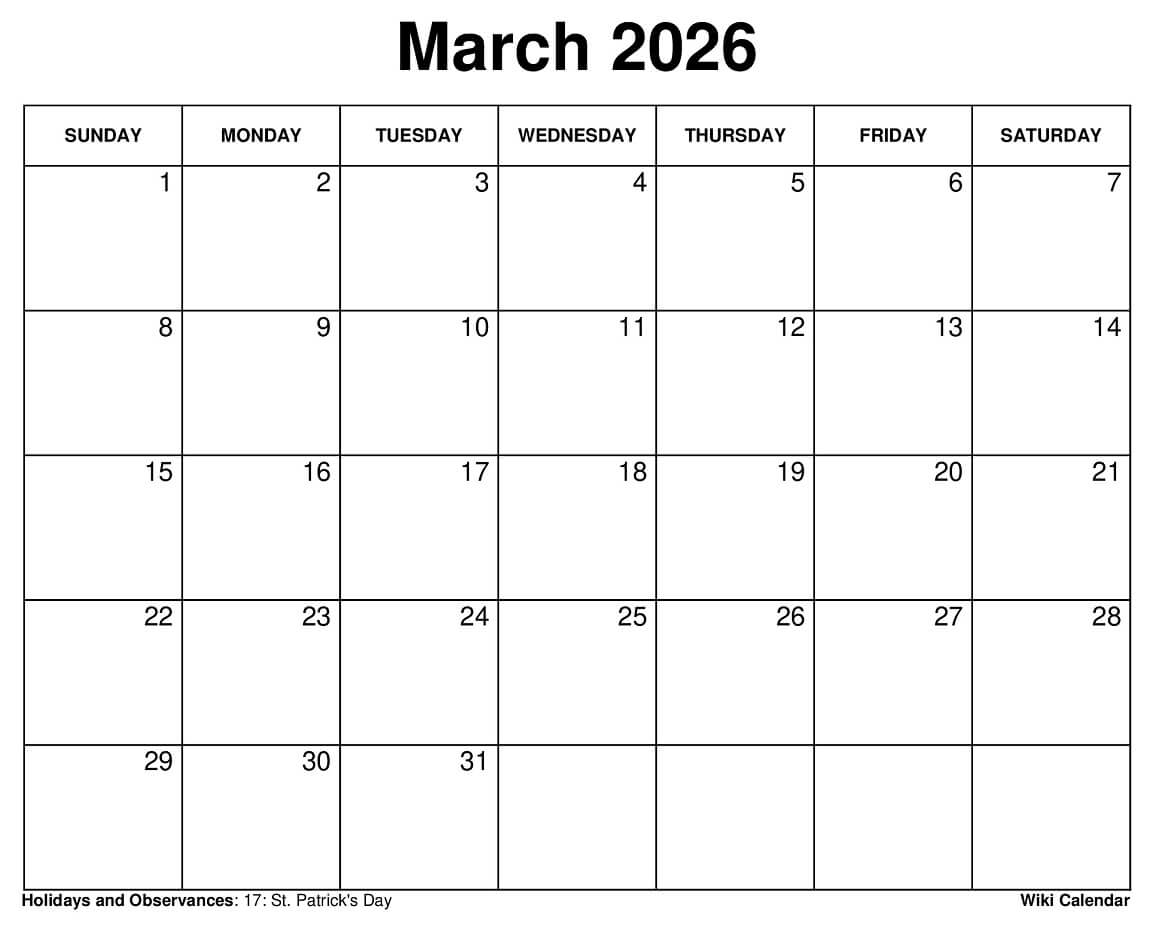 Do you prefer a minimalist design or need a calendar that you can fully tailor to your unique schedule? Our blank March 2026 calendar is the answer. This printable template provides a clean, streamlined layout that’s ready for your personal touch. Fill it with your appointments, deadlines, birthdays, and any other important events to craft a personalized planner for the entire month.